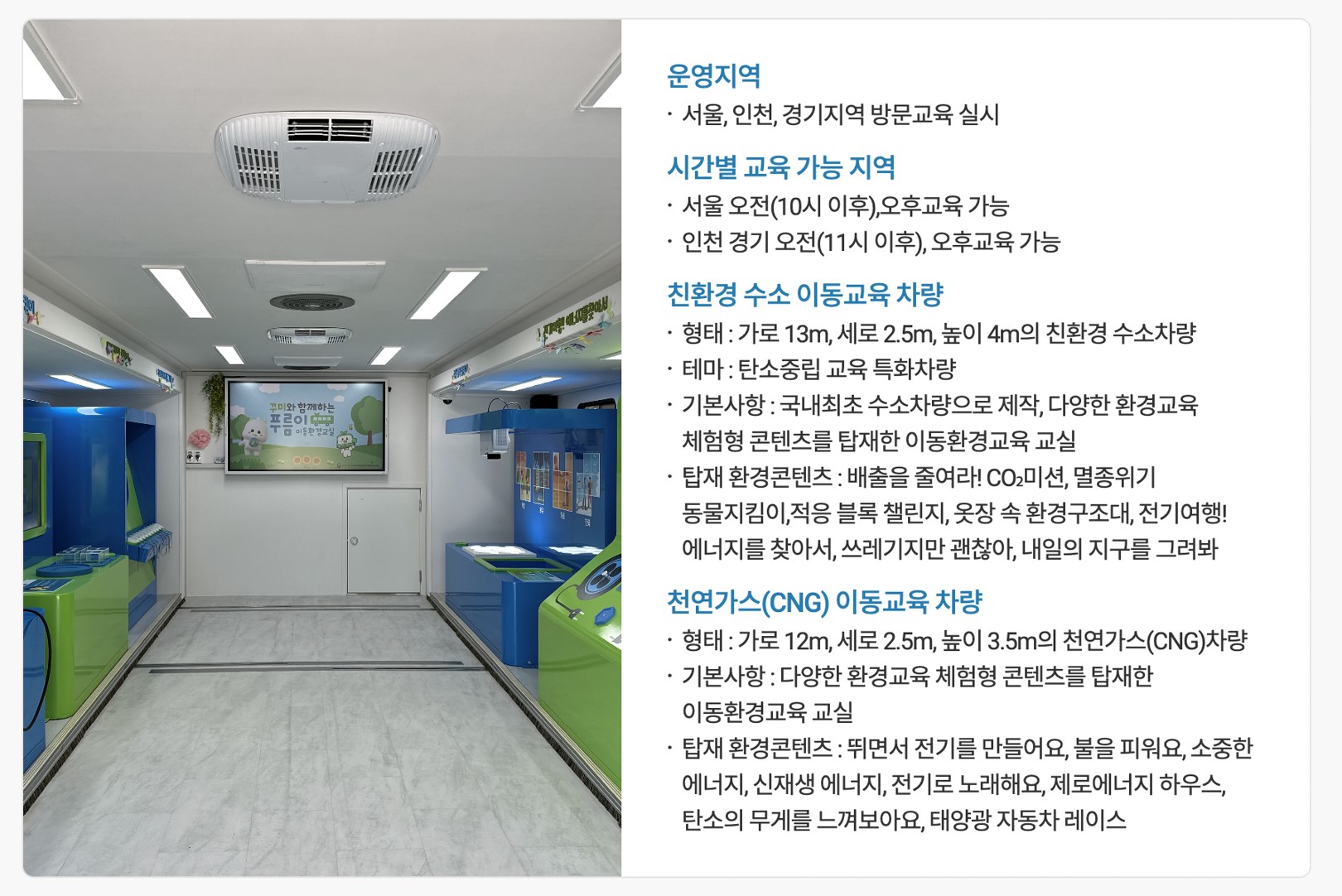 • 푸름이 이동 환경 교실: 버스를 멋지게 개조해서 만든 '움직이는 환경 교실'입니다. 이 버스는 서울, 인천, 경기 등 수도권 지역의 학교로 직접 찾아와 신기한 실험과 재미있는 체험 활동을 제공합니다.