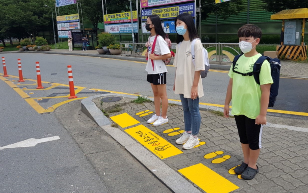 초등학교 주변 횡단보도 앞 인도에 노란색 발자국 스티커를 붙여, 어린이들이 신호를 기다릴 때 차도 쪽으로 가까이 서지 않고 일정 거리를 유지하도록 유도합니다.